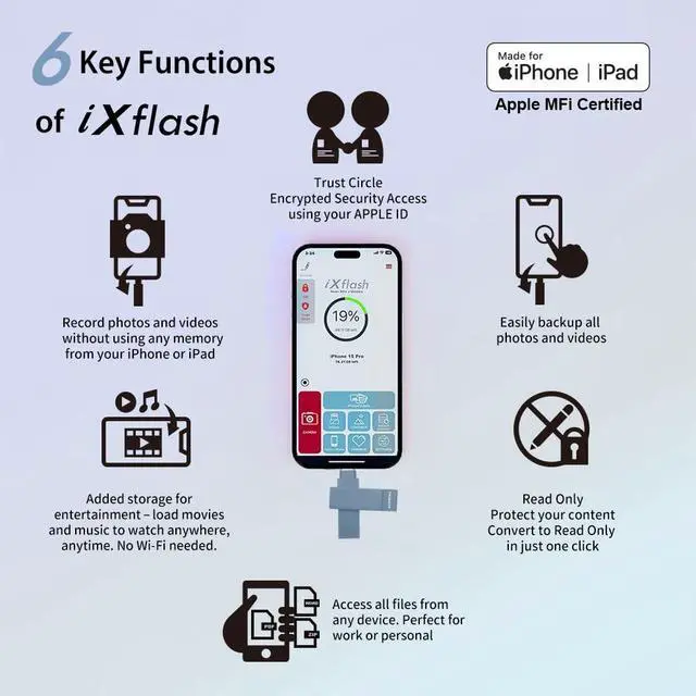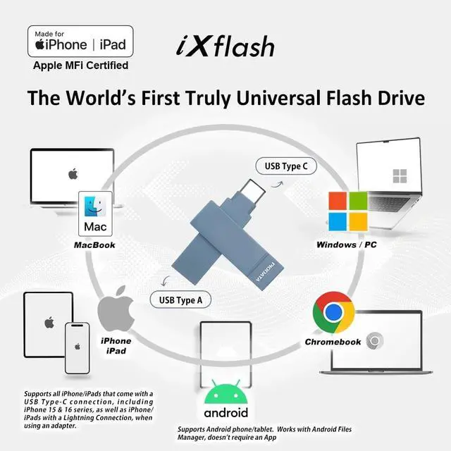 Its also compatible with the latest iPhones and iPads using USB Type C, along with the free iXflash iOS app for effortless usage. ^^ [Worlds first Apple MFi certified Flash drive without a Lightning connection to Backup, Restore, and/or Transfer Files Between Devices] Easily backup and restore photos and videos from your iPhone or iPad while preserving all metadata, such as formats, dates, and locations. The iXflash can transfer all sorts of content, like PDFs, Word documents, and Excel files, between iPhones, iPads, and computers.