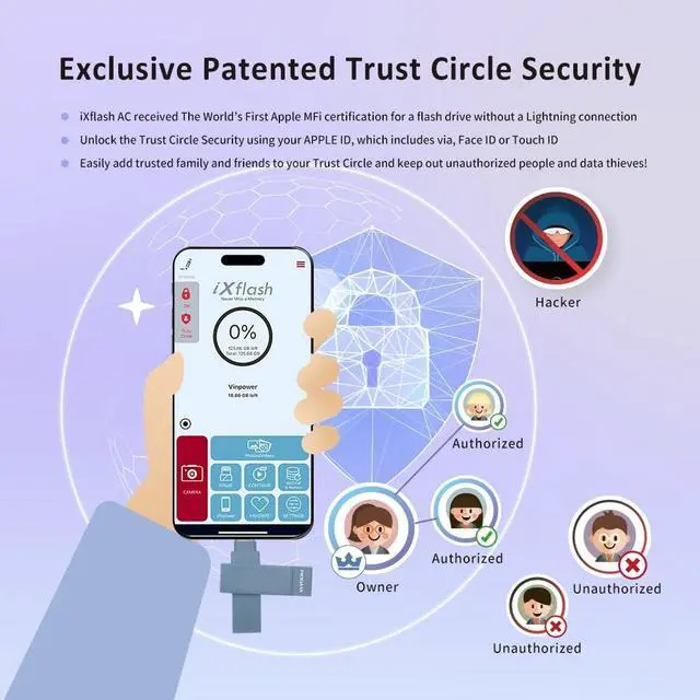 ^^ [Advanced Security with Trust Circle and Read Only Protection] The patented Trust Circle AES 256 Key-Lock security prevents unauthorized access to your stored data. Only authorized users within the "Trust Circle" can access the files, ensuring complete privacy. Additionally, the Read Only feature safeguards files from being modified or deleted and shields the drive from potential viruses, making it a secure USB flash drive for iPhones, iPads, and other devices. ^^ [Play Hi-Res Music Files] Enjoy high-resolution audio files, such as FLAC, directly on your iPhone or iPad using the iXflash app, which provides superior audio quality compared to MP3 files.