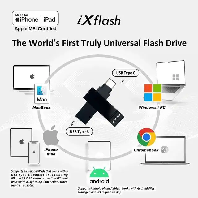[Apple iPhone Dual USB Type A and USB Type C Connectivity for Versatile Use] The iXflash is a USB 3.2 Gen1 drive featuring both USB Type A and USB Type C interfaces, allowing it to work with a wide range of devices. With the help of an optional USB-C to Lightning adapter, its also compatible with iPhones and iPads using Lightning ports, making it suitable for nearly all USB or Lightning-enabled devices such as iPhones, iPads, computers, Android devices, TVs, and more. It's the ideal iPhone USB flash drive for photo transfer and works perfectly with the latest iPhone models using USB Type C, in conjunction with the free iXflash app for iOS devices.