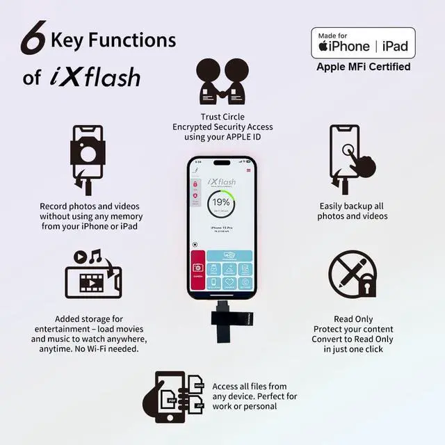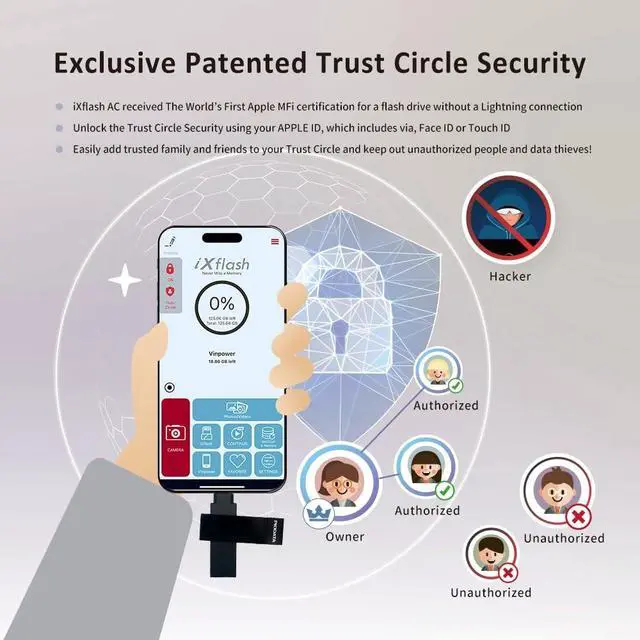 ^^ [No App Needed]- While using the Free iXflash App provides more features and offers more convenience, some users may prefer not to use an App. In that case, the iXflash works directly with nearly all USB Type C connected smartphones and tablets, including the latest iPhone 15 / 16 / 17 or later Series, without an App. Easily plug in the iXflash when the iXflash App is not installed and use it with the standard preinstalled Apple Files App. ^^ [High-Level Security with Trust Circle and Read-Only Mode] The patented Trust Circle AES 256 Key-Lock security system ensures that only authorized users can access the data stored on the iXflash.