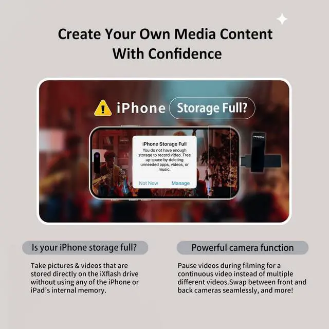 ^^ [Record Photos and Videos Directly to the iXflash] Take photos or record videos directly onto the iXflash, bypassing your iPhone or iPads internal storage. This feature is ideal for anyone seeking extra storage for iPhone photos or videos without worrying about running out of space on the device. ^^ [Advanced File Management Capabilities] Manage files effectively with the ability to create, open, and password-protect ZIP files, like. rar,. 7z,. zip. The iXflash supports a wide variety of formats, including Word, Excel, PowerPoint, PDF, and more, making it a versatile USB drive for iPhones, whether for personal or professional use.