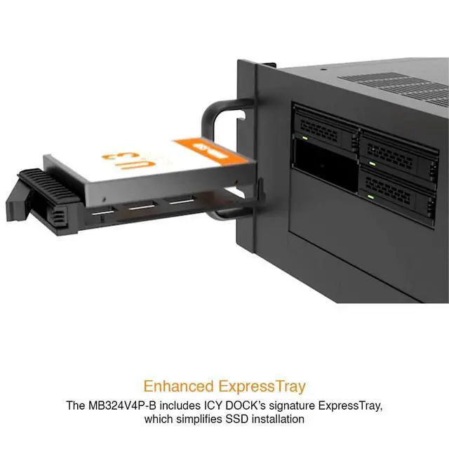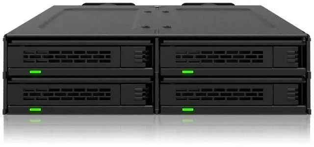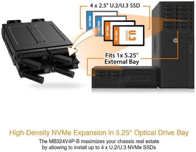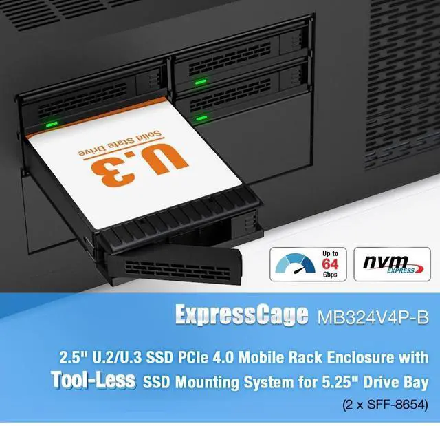 The ICY DOCK ExpressCage MB324V4P-B is a high-performance mobile rack designed to house up to four PCIe 4.0 U. 2/U. 3 NVMe SSDs (up to 15mm height) within a single external 5.25 optical drive bay. Building on the ExpressCage series renowned tool-less SSD mounting system, the MB324V4P-B combines fast drive swaps, secure SSD retention, and optional screw-lock support into one robust design. Unlike most tool-less systems that sacrifice mounting stability, ExpressCages removable tray design with additional screw holes delivers both hot-swappable convenience and reliable SSD retention, earning trust from enterprise storage builders and performance enthusiasts alike.