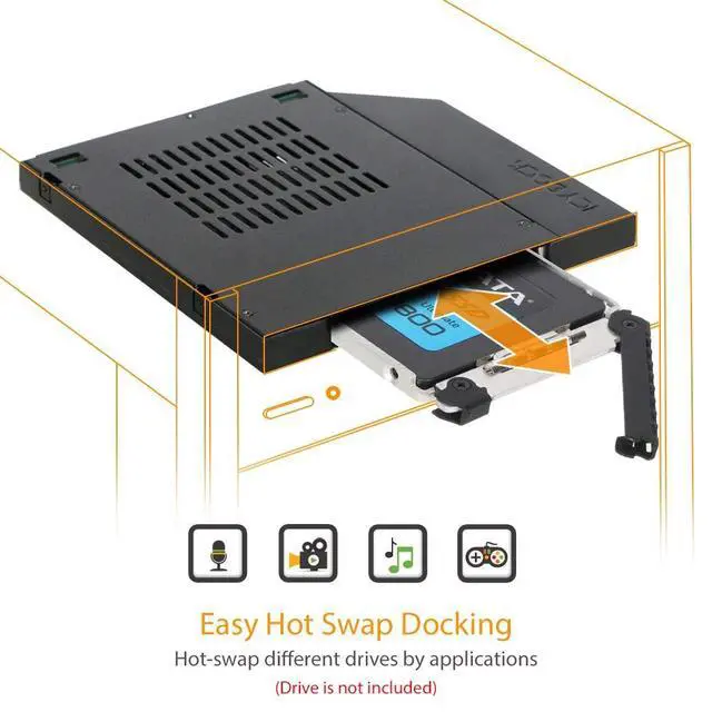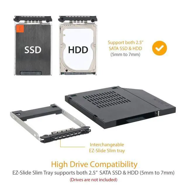 Fits 1 x 5mm to 9.5 mm height 2.5 SATA HDD / SSD in a 12.7 mm slim ODD bay. ^^ Supports transfer speed up to 6Gbps ^^ The receiving SATA connector rated for up to 10, 000 drive insertions ^^ Heavy-duty full metal construction design - perfect for enterprise applications ^^ Active Power Technology (APT) powers up individual LED if only there is a drive installed in the drive bay