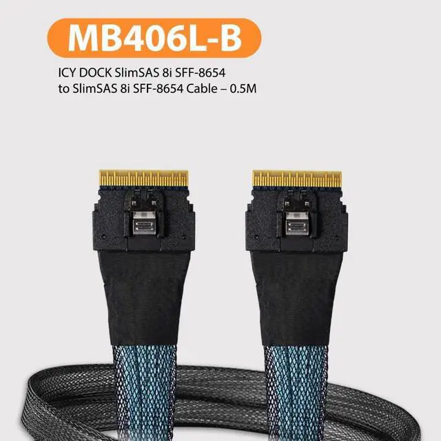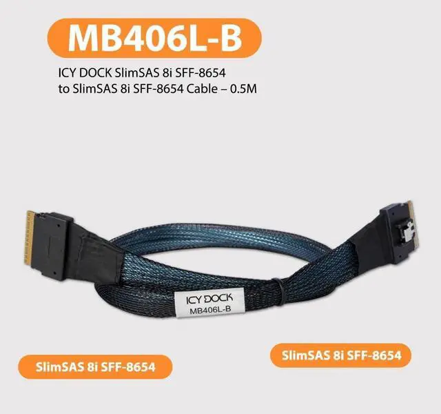 The MB406L-B is an Internal SlimSAS x8 (SFF-8654) to SlimSAS x8 (SFF-8654) Cable to connect an HBA/RAID card to the following ICY DOCK enclosures: MB105VP-B and MB118VP-B