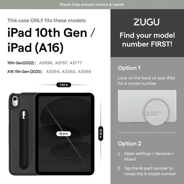 You'll Love Your Zugu Case...We Guarantee it - Because our cases are built to stand the test of time, we offer an industry-leading 2-year warranty. If you need any support with your new Zugu Case please reach out as we are always happy to help! Designed for the 2025 iPad (A16) 10.9 inch 11th Generation and 2022 iPad 10.9 inch 10th Generation (Back of iPad model #s A3354, A3355, A3356, A2696 / A2757, A2777)