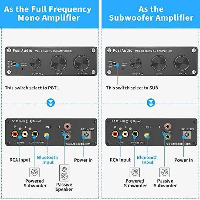 Switch to PBTL(As a full frequency mono amp): You can use the banana plugs or bare wires to connect the passive subwoofer to the M01-BT, use the RCA cable to connect the powered subwoofer to the M01-BT.
