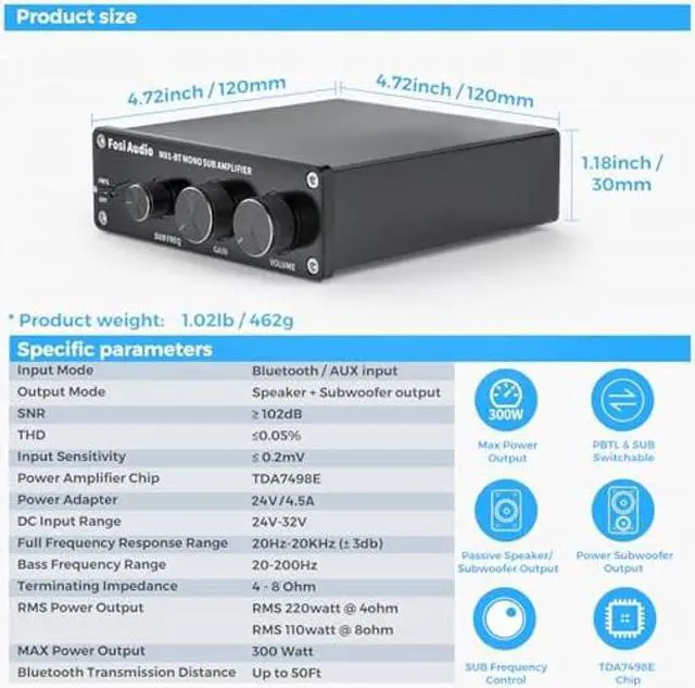 Fosi Audio M01-BT Bluetooth 5.0 300 Watt Subwoofer Amplifier Home Theater Full-Frequency Mini Stereo Audio Hi-Fi Mono Power Amp with Bass Gain Control for Passive Subwoofer Speaker Bass Shaker