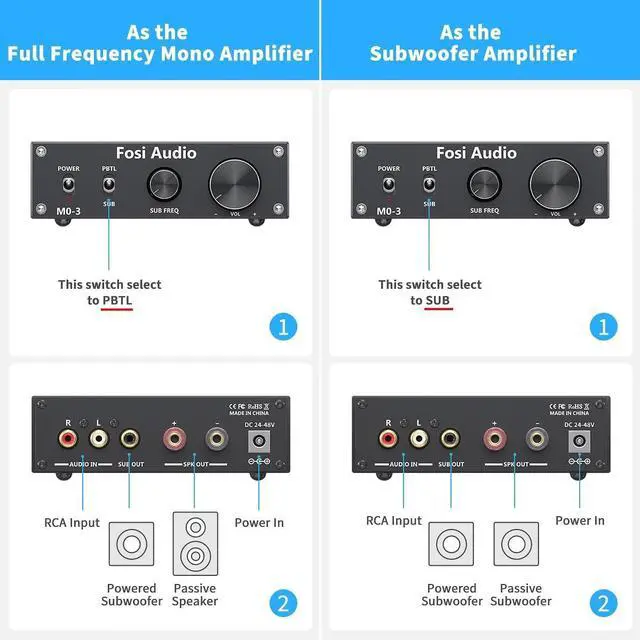 Full-Frequency Mono Amp: The audio amplifier offers versatile functionality with two modes. Switch to PBTL mode to use it as a full-frequency mono amplifier for driving passive speakers and powered subwoofers. Switch to SUB mode to use it as a dedicated subwoofer amplifier for driving passive and powered subwoofers.