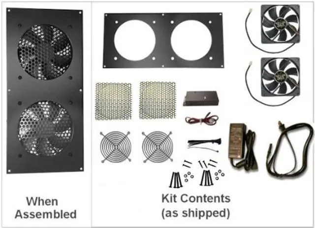 (2) Ultra quiet 120mm Fans ^^ (1) Thermal controller (pre-set non-adjustable) On @ 86F Off @ 81F (+/- 1) ^^ All necessary screws, cables, and fasteners to complete the unit. ^^ Completed dimensions: 13" x 6.25.