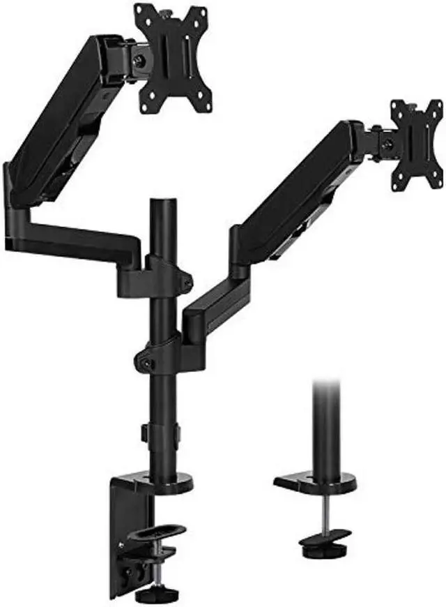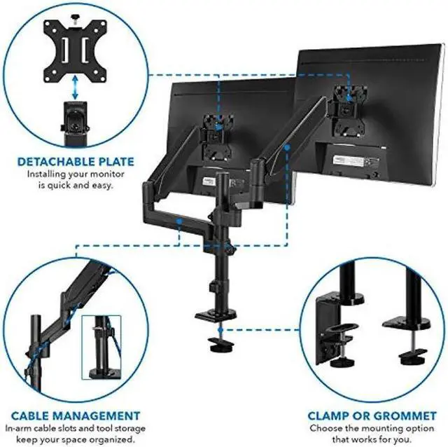 FEATURES: Vertical monitor mount has counterbalanced, gas spring arms for effortless adjustments, and screens can be stacked in a vertical or horizontal configuration. Comes with integrated cable management and is made out of heavy duty steel and aluminum alloy.