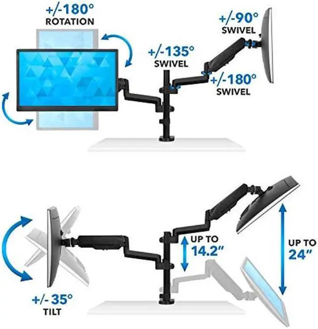 FULLY ADJUSTABLE: Vertical dual monitor stand can tilt up and down 35 degrees in either direction, swivel left and right 360 degrees, and raise or lower a total of 14.2 inches. Monitors can be rotated 180 degrees for portrait or landscape orientation independent of each other.