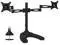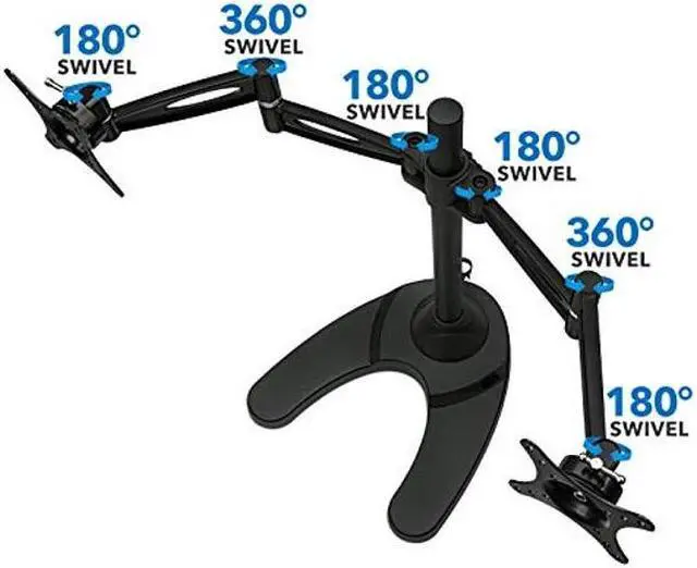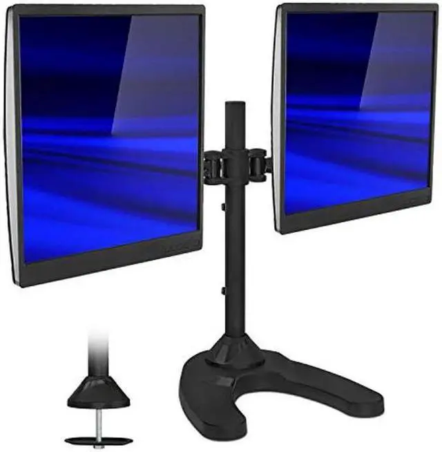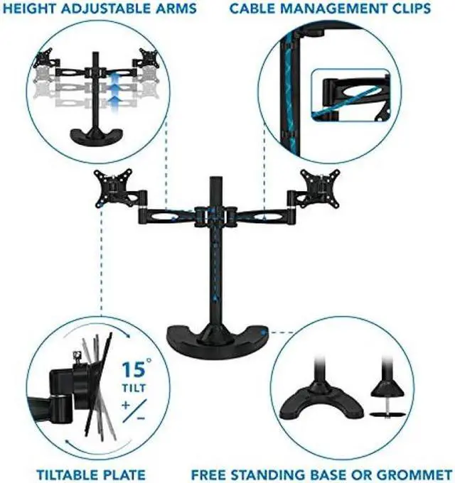 Features: 17" inches of height adjustment Tilts 15 degrees up and 15 degrees down Monitor can be placed in either landscape or portrait orientation Heavy duty steel construction will stand the test of time Supports up to a whopping 22 pounds! Black powder coat finish is highly scratch resistant Free standing base allows for quick and convenient placement on all desktops - so easy even a caveman can do it! It also includes all of the necessary hardware required for quick assembly and comes with an instructional manual Double monitor mount comes with a 5-YEAR WARRANTY Friendly, US-based customer service department is available to answer any questions you may have during normal business hours