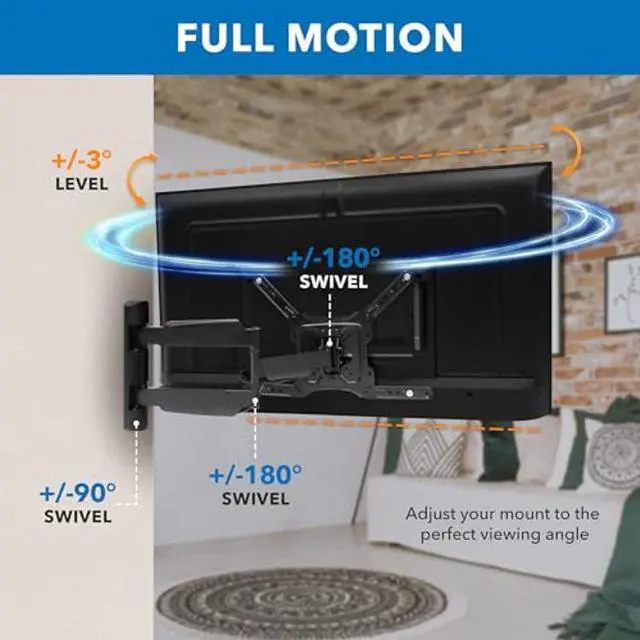 OPTIMAL VIEWING ANGLE: Enjoy the convenience of full motion adjustment with this articulating TV mount. It allows for tilt and swivel, helping to reduce glare and improve your viewing comfort. The swivel functionality ensures you can achieve the perfect viewing angle from any seat in the room, making your TV watching experience more enjoyable.
