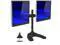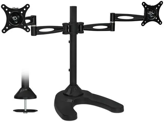 FEATURES: Double monitor mount has full motion, height adjustable articulating arms and are made of heavy duty steel, and have integrated cable management clips on each to keep your cables organized. Comes with both interchangeable free standing and grommet bases.