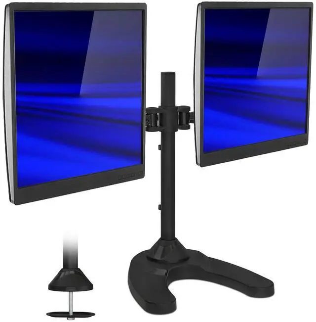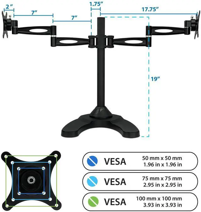 FREE STANDING DUAL MONITOR STAND: Fits two monitors 19 20 21 22 23 24 25 26 27 inches, with a maximum support weight of 22 pounds each, using the 75x75mm or 100x100mm VESA square bolt hole pattern found on the back of the monitors.