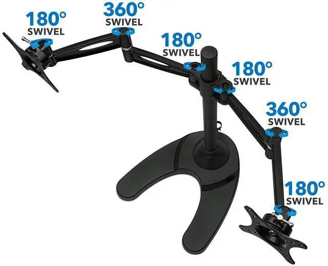 FULLY ADJUSTABLE: Two monitor mount arms can tilt up and down 15 degrees, swivel left-right 360 degrees, raise and lower 17" inches on the pole, and each screen can be rotated and placed in portrait or landscape orientation independent of one another.
