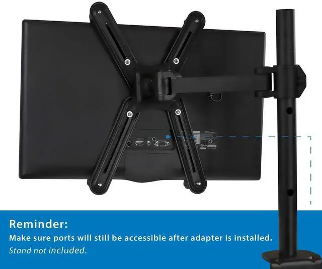 NON VESA MONITOR ADAPTER These adapter arms allow mounting non-VESA monitors to VESA monitor mount desk and wall mounts. Designed to fit any VESA monitor mount with 75x75 and 100x100mm mounting holes, and includes all required screws and other hardware for assembly ^^ UNIVERSAL VESA MOUNT KIT Designed for Dell, Samsung, HP, Acer, Asus, AOC, Viewsonic monitors that do not have a standard bolt hole pattern. Adjustable monitor arm adapters can be placed in many positions to accommodate varying sizes and shapes of monitors ^^ WIDE COMPATIBILITY - Fits screen thickness of 1 inch to 2.75 inches and bezel height from 10.5 inches to 16.25 inches.