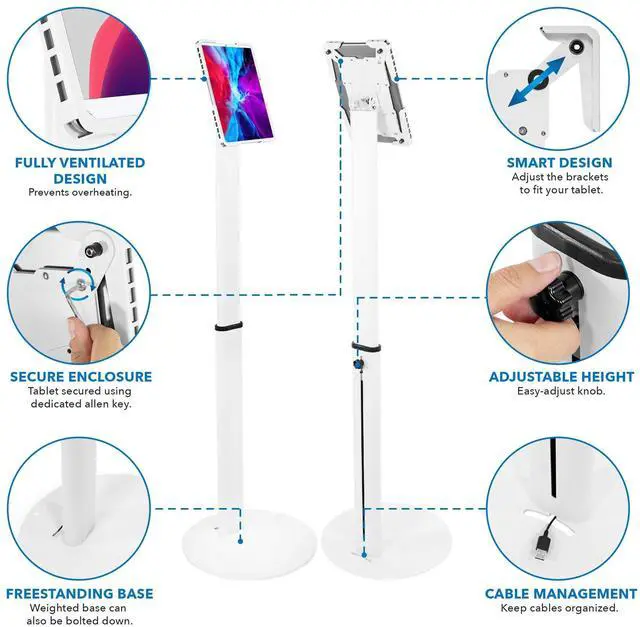 Restricted access to buttons and ports make discourage unwanted pressing. Cable management floor stand to keep all wires organized ^^ FREE STANDING FLOOR STAND - Portable tablet floor stand with wide base for any surface material; For added security and stability bolt down the wide base