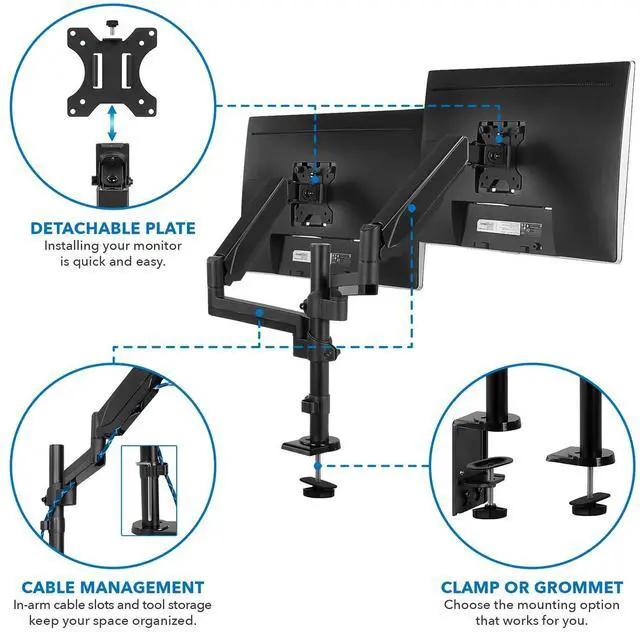 Install: Built with heavy-duty aluminum and steel, this dual screen monitor mount includes both a C-clamp (for desktops up to 3.1 thick) and a grommet base (up to 1.5 thick) for secure installation. ^^ Tested for