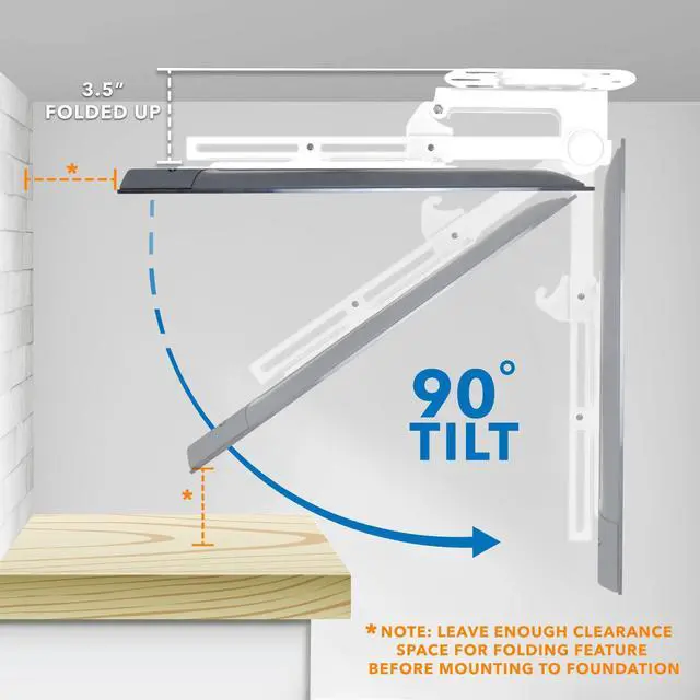 ^^ Works on flat or slanted ceilings A smart solution when wall mounting isnt possible, designed for unique installs and flexible layouts. ^^ Strong and secure build Heavy-duty steel construction, strength tested to 132 lbs, with a locking arm to keep your TV safely stowed. ^^ Check clearance before purchase Requires at least 3.5 of space when folded; confirm ceiling/wall clearance for proper flip-up motion. ^^ Confirm VESA hole location TVs with mounting holes near the bottom may not fit; max supported distance to TV top is 19.4 (200x200), 21.4 (300x300), 23.4 (400x400).
