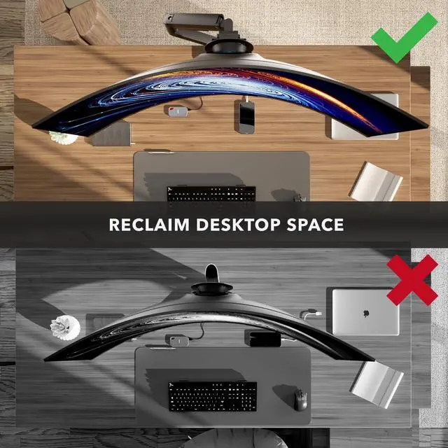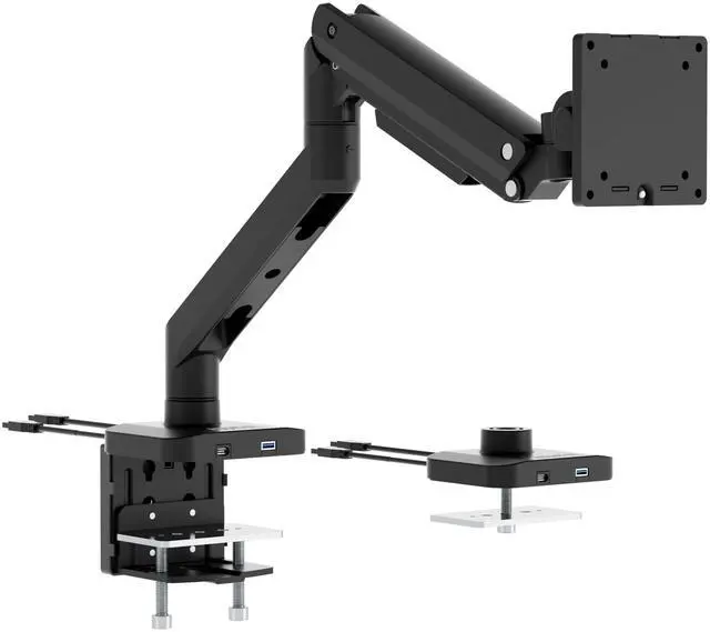^^ Integrated desktop connectivity Built-in USB-C and USB 3.0 ports provide convenient access for charging and peripherals, helping reduce under-desk cable clutter and improving workflow efficiency. ^^ Strong, stable, and built to last Constructed using high-strength steel and aluminum with reinforced joints, this mount maintains steady positioning even with heavier ultrawide monitors, delivering reliable performance over years of daily adjustments. ^^ Flexible installation options Choose between C-clamp or grommet mounting to fit desks 0.4" to 3.35" thick. All hardware and tools are included so you can complete a confident installation. Integrated cable management channels guide wires neatly along the arm, reducing visual clutter and keeping your workspace organized and distraction-free.