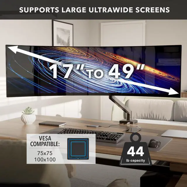 Professional-grade support for large screens Engineered to hold 1749 monitors up to 44 lbs, this heavy-duty arm provides the stability needed for ultrawide and curved displays in high-performance work environments. ^^ Effortless adjustability for comfort The gas spring arm enables smooth height adjustments from 10.5" to 21.65" with precise +50/-20 tilt, 180 swivel, and 180 rotationideal for long work sessions, creative tasks, or hybrid work setups. ^^ Designed for refined workspaces Elevate the look of your desk with a sleek matte black finish, clean lines, and an upgraded build that complements modern offices, studios, and premium home workstations.