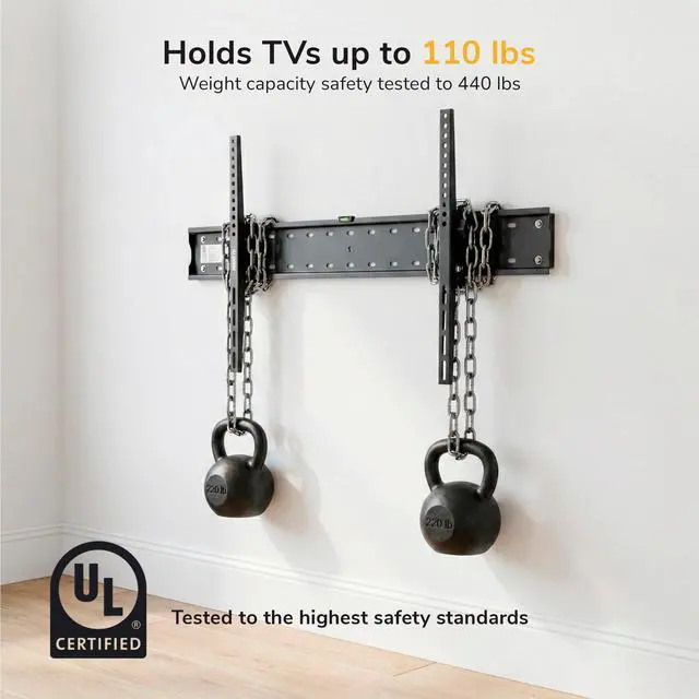 UL CERTIFIED TV MOUNT: With its UL certification guaranteeing a tested weight capacity of 440 lbs (4x certified load of 110 lbs), this sturdy TV mount not only prioritizes safety and durability but also instills confidence in securely mounting your TV, offering peace of mind.