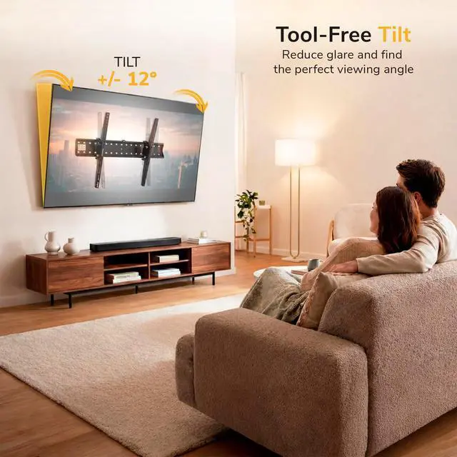 OPTIMAL VIEWING ANGLE: Enjoy unparalleled convenience with our TV mount's fingertip tilting feature, allowing you to effortlessly achieve the optimal viewing experience. Tilt your screen with ease to find the perfect angle, minimizing glare and elevating your overall viewing comfort.