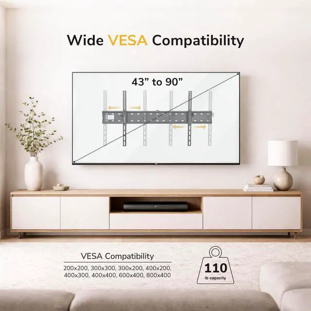 ^^ VERSATILE COMPATIBILITY: This UL Listed low profile tv mount emphasizes extensive compatibility, supporting an array of TVs ranging from 43 inches to 90 inches. Whether you possess a sophisticated flat-screen or an elegant curved display, our tilt TV wall mount is engineered to cater to your TV requirements. Holding up to 110 lbs, it provides a secure and stable mounting solution.