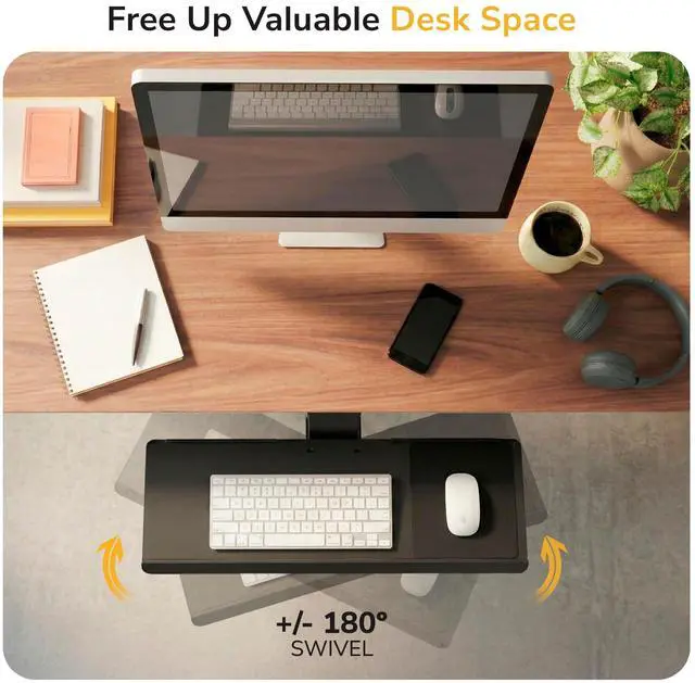 Reclaim desk space and improve comfort Store your keyboard and mouse underneath the desk to free up surface space while creating a cleaner, more organized workstation. ^^ Adjust for personalized ergonomics Easily fine-tune height and tilt with a simple control knob, then swivel the tray left or right to support a more neutral typing position throughout the workday. ^^ Extra-wide one-piece keyboard platform The 26.5" W 10" D solid under desk keyboard drawer provides ample room for full-size keyboards and mouse use without seams, flex, or cramped layouts. ^^ Smooth slide-out positioning Keyboard tray glides on under-desk tracks and functions as a slide-out keyboard tray under desk, letting you pull it closer while typing or push it away when not in use.