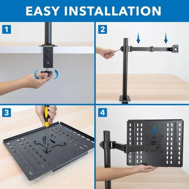 ^^ SAVE DESK SPACE: Free up valuable desktop space with the Mount-It! Laptop Desk Mount. The heavy-duty base, equipped with both clamp and grommet mounting options, securely attaches to desks up to 3.4 inches thick, making it an ideal solution for limited space applications by keeping your work area clutter-free.