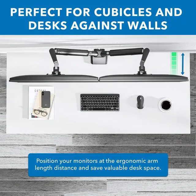 ^^ SPACE SAVING DESIGN: Specifically engineered for cubicles and desks with privacy walls, this dual monitor arm features low-profile front arms that fit seamlessly without extending too far into your workspace. Achieve flawless monitor alignment while maintaining the ideal ergonomic distance, keeping your desk clutter-free.