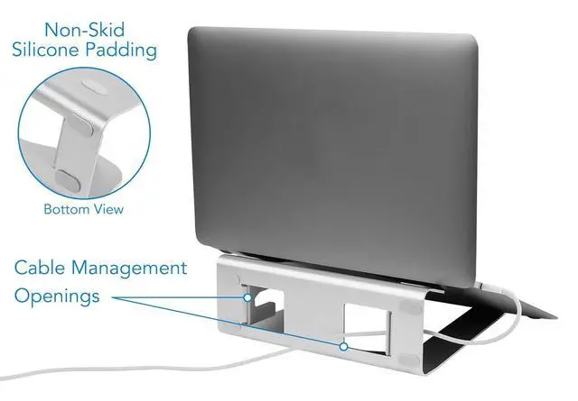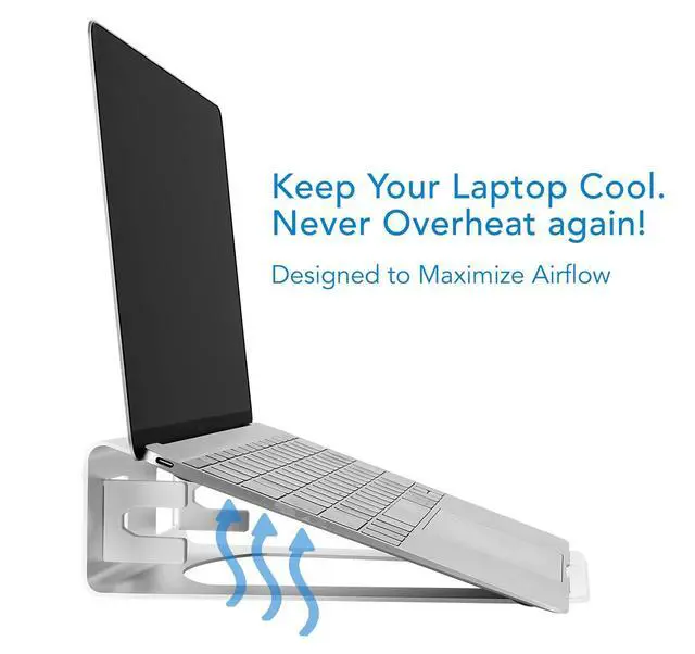 ^^ Premium aluminum construction Single-piece aluminum design delivers a sturdy, stable feel while complementing modern laptops and minimalist desk setups. ^^ Improves airflow and cable organization Open design with cutouts promotes ventilation and helps manage cables, keeping your laptop cooler and your workspace organized. ^^ Ergonomic viewing angle Angled laptop position helps reduce glare and eye strain while aligning your screen more naturally with external displays. ^^ Simple, tool-free setup No assembly required; anti-slip rubber padding keeps your laptop securely in place. Backed by US-based support and a lifetime warranty for long-term confidence.