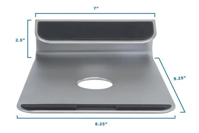 Stylish Laptop Riser Stand - A Premium MacBook Pro Stand Designed To Complement MacBooks, Surface, And Chromebooks; Constructed Of Lightweight Brushed Aluminum For Durability And Stability ^^ Ergonomic Laptop Stand - The Elevated MacBook Stand Improves Typing Comfort and Efficiency and Helps Reduce Neck Pain and Eye Strain; Supports the iPad Pro at a Perfect Angle For Use With Apple Pencil ^^ Better Airflow, Improves Cooling - The Angled Wedge Laptop Stand Increases Airflow Around the Laptop For Optimal Performance; Cooling MacBook or iPad Pro 12.9 Vented Stand ^^ Anti-slip Laptop Wedge - Rubberized Edges on the Laptop Riser Secures Your MacBook From Sliding During Use; Padded Feet Keep Tabletop Riser Stable; Perfect For Glass Or Wood Desktops ^^ Organize Your Work Space - Open Design with Stand Cutouts Promote Cable Management for a Clean Desk; Keep Cords and Wires in Place and Out of the Way During Use.