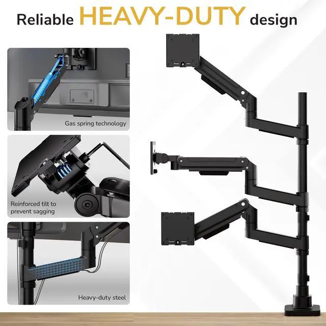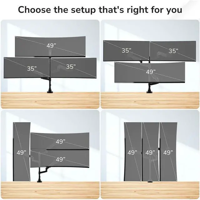 True 2+1 stacked monitor configuration Designed specifically for vertical and tiered setups, this triple monitor desk mount supports two monitors side by side with a third mounted above or below, creating an efficient stacked workstation rather than a flat, side-by-side layout. ^^ Supports large ultrawide displays up to 49 inches The center arm securely holds a single ultrawide monitor up to 49", while the side arms support monitors up to 35" each, making this mount ideal for ultrawide + dual screen productivity, trading, and creative workflows. ^^ Heavy-duty gas spring arms 44 lb capacity each All three arms use premium gas spring technology with reinforced tilt joints, providing smooth fingertip height adjustment and reliable support for heavier monitors without sagging or drifting.