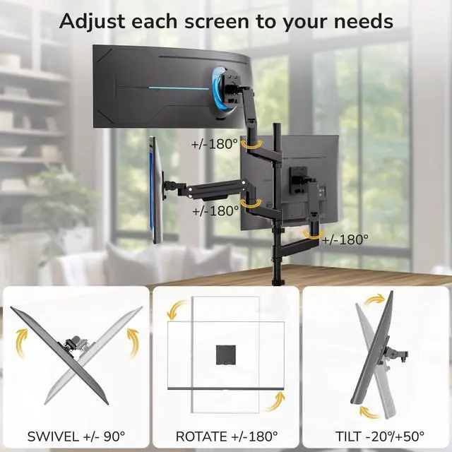 ^^ Fully adjustable for ergonomic viewing Each screen adjusts independently with tilt (-20 to +50), swivel (90), and rotation (180), allowing precise alignment for reduced neck strain, glare control, and all-day comfort. ^^ Quick-disconnect VESA plates for easy installation Detachable VESA mounting plates (75x75 and 100x100) allow monitors to be mounted or removed quickly, simplifying installation, upgrades, and cable access. ^^ Clean, professional desk mounting with cable management Includes both top clamp and grommet mounting options for desks 0.41. 8 thick, with integrated cable management channels that route wires through the arms and pole for a clean, organized workspace.