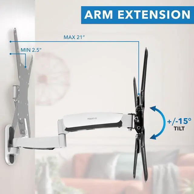 FULL MOTION GAS SPRING ARTICULATING ARM Counterbalance system provides smooth movement with 13.5" of vertical height adjustment, allowing effortless repositioning and improved viewing comfort. ^^ DESIGNED FOR 2555 INCH FLAT SCREEN TVS Supports TVs weighing up to 44 lbs and compatible with VESA mounting patterns from 100x100mm to 400x400mm. ^^ ADJUSTABLE GAS SPRING TENSION Arm tension can be fine-tuned to match your TVs weight for stable positioning without sagging. ^^ EXTENDED SWIVEL AND TILT FLEXIBILITY Swivels 180 on two joints and 330 on one joint, with 15 tilt up or down to reduce glare and optimize viewing from multiple seating positions.