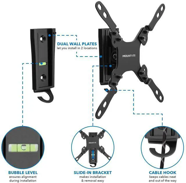 Whether indoors or out, this mount provides ergonomic viewing flexibility for cooking, relaxing, or gathering with friends. ^^ LOW-PROFILE DESIGN PERFECT FOR TIGHT SPACES The 2.5 slim profile keeps your TV snug against the wall when not in useideal for compact RV interiors, toy haulers, or trailers where space matters. Stay streamlined without giving up motion range or strength. ^^ UNIVERSAL FIT FOR SMALL TO MID-SIZE SCREENS Compatible with TVs from 13" to 43" and up to 33lbs, this bracket supports VESA patterns from 75x75mm to 200x200mm. The package includes all necessary mounting hardware for both wood studs and concrete/brick surfaces, a built-in bubble level, and a cable hook for a tidy finish.