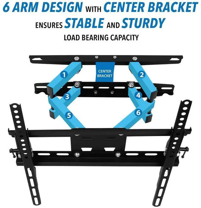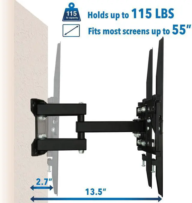 Hassle-Free Installation Mount Your TV in Minutes! No need to struggle with complicated setups! This easy-to-install TV wall mount features pre-labeled parts, step-by-step instructions, and all necessary hardware for a quick and seamless setup. (Perfect for renters and homeowners! ) ^^ Stable Dual Arm Design Superior Strength & Durability Unlike single-arm mounts, this dual-arm articulating TV mount provides extra stability and prevents sagging. Built with reinforced steel, it holds up to 115 lbs, ensuring your TV stays secure with zero wobble. ^^ Universal Fit for 32-55 TVs Strong & Secure Designed to fit most 32-55 inch TVs, this wall mount TV bracket supports VESA patterns up to 400x400mm and is compatible with Samsung, LG, Sony, TCL, Vizio, Hisense, and more.