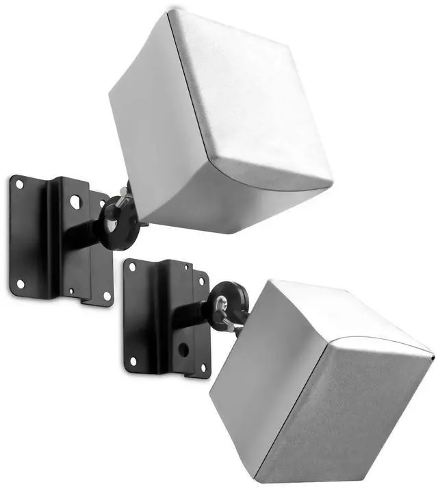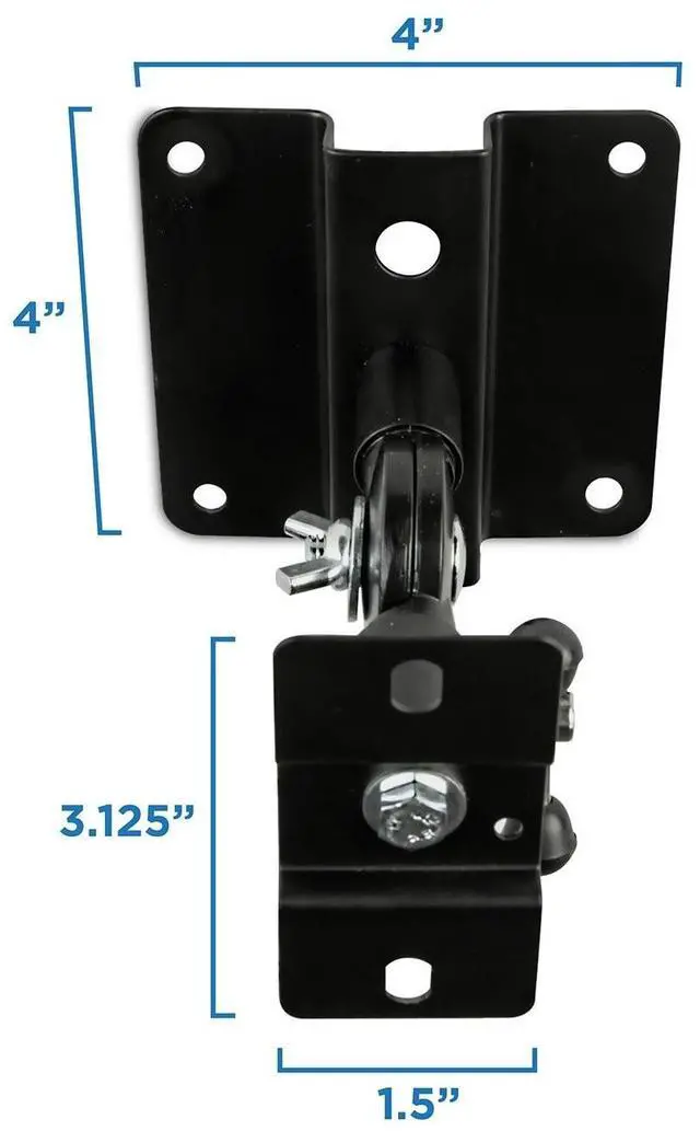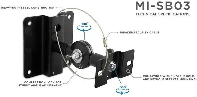 Mount-It! heavy duty speaker mount is made for home theater satellite speakers, studio monitors and bookshelf speakers. Made from high-strength steel and aluminum, the mount can carry larger speakers up to 33 lbs. Easy to install. Lag bolts and concrete anchors provided for ceiling, dry wall and concrete/brick installation. Speaker mounting bolts (M5x10mm) also included. Tilting compression joint can tilt up to 90 degrees up or down and can be locked in the desired tilt angle in between. Speaker mounting head can rotate 360 degrees. The speaker mount comes with a steel braided cable for theft deterrence and to provide additional installation safety between the wall plate and the speaker plate.
