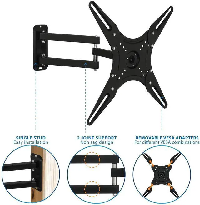 Low-profile design ensures TV is close to the wall for a sleek finish. Ballhead TV mounting head allows 360 degrees of rotation. This feature ensures the TV is horizontally leveled and allows TV installation in landscape of portrait mode, perfect for signage. ^^ Weight rated to 66 lbs - This bracket is one of the strongest single arm articulating brackets available on. Install your precious TV with confidence. Constructed from Reinforced Steel. Quick and easy to install - bracket comes complete with full instructions, Free 3-axis bubble level and FREE INSTALLATION HARDWARE