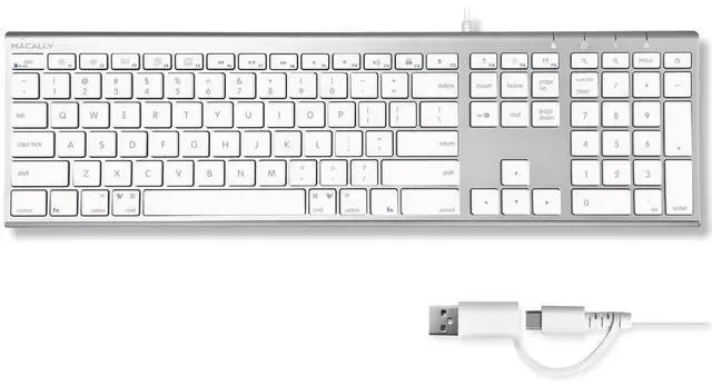 Macally USB C Keyboard (Upgraded) - Dual USB A + C Plug - Wired Keyboard for Mac - Ultra Slim, 20 Shortcuts, 110 Scissor Keys - for MacBook Pro/Air, Mac mini, iMac, iPad - Silver