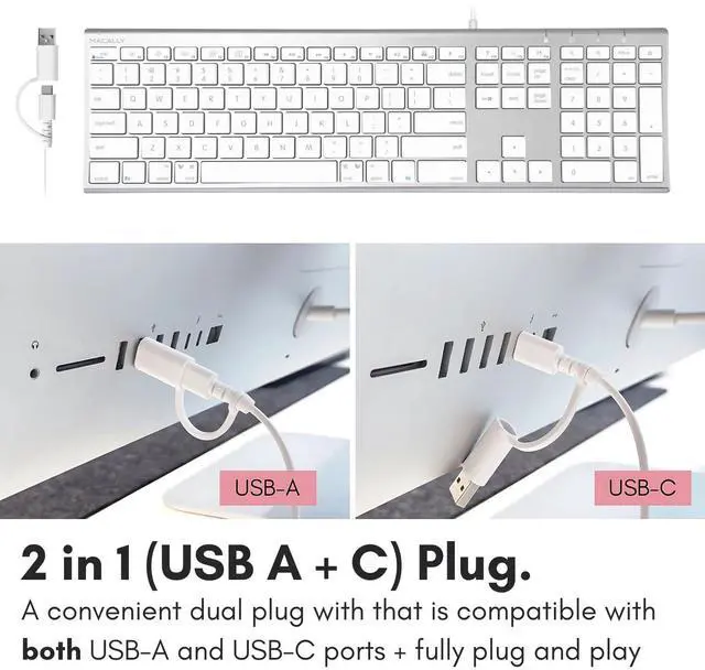 2 in 1 USB C + A Plug: Enjoy seamless connectivity with any laptop or computer. This apple wired keyboard offers a versatile 2-in-1 USB C and USB A plug, to accomodate a wide range of usb devices. Mac, PC, iOS, Android.