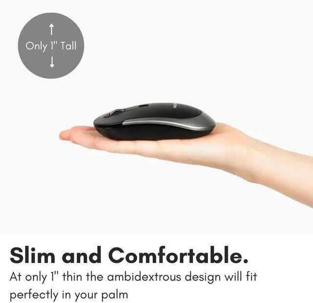 800/1200/1600 DPI switch button to adjust sensitivity for more precise control^^Silent soft-click buttons and scroll wheel for quiet and smooth control^^Stylish matte slim and ambidextrous design ^^Bluetooth wireless connectivity up to 10 m (30 ft) ^^ Two "AAA" batteries last up to 3 months of use (at 8 hours of daily use) * ^^ * Battery life may vary depending on user and computing conditions.