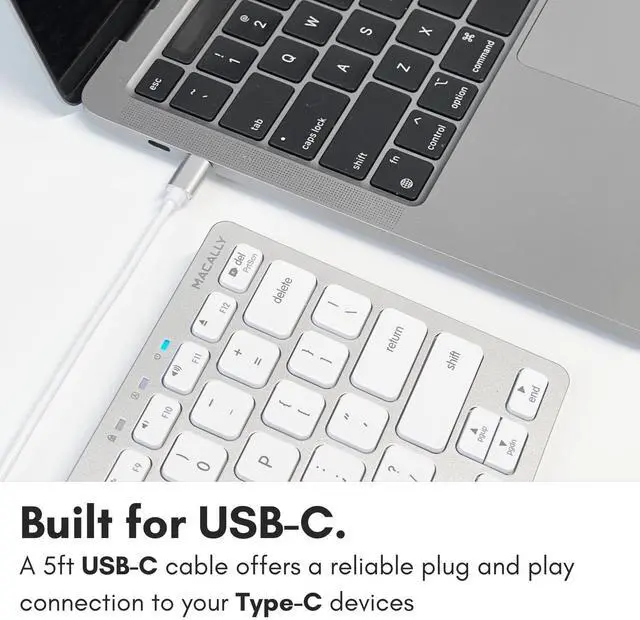 USB-C: Simply connect the 5 ft cable of our Type C keyboard to any device equipped with a USB C port, such as a MacBook, iPad, PC, or iMac.