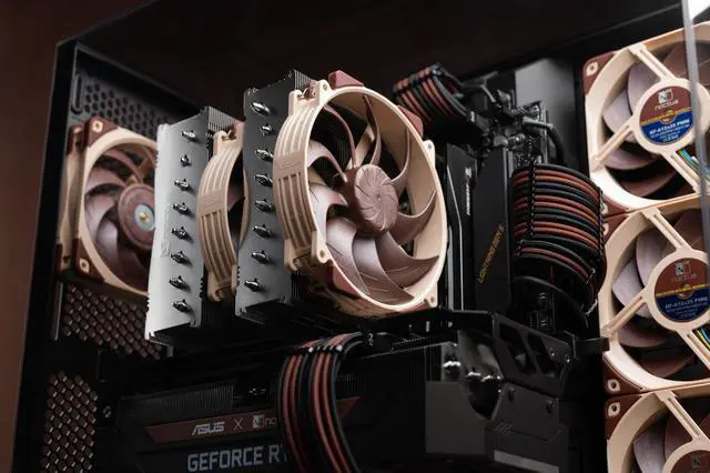 Two state-of-the-art NF-A14x25r G2 140mm fans with speed-offset for acoustic fine-tuning, Low-Noise Adaptors and PWM for automatic speed control: maximum efficiency under load, near silent at idle!