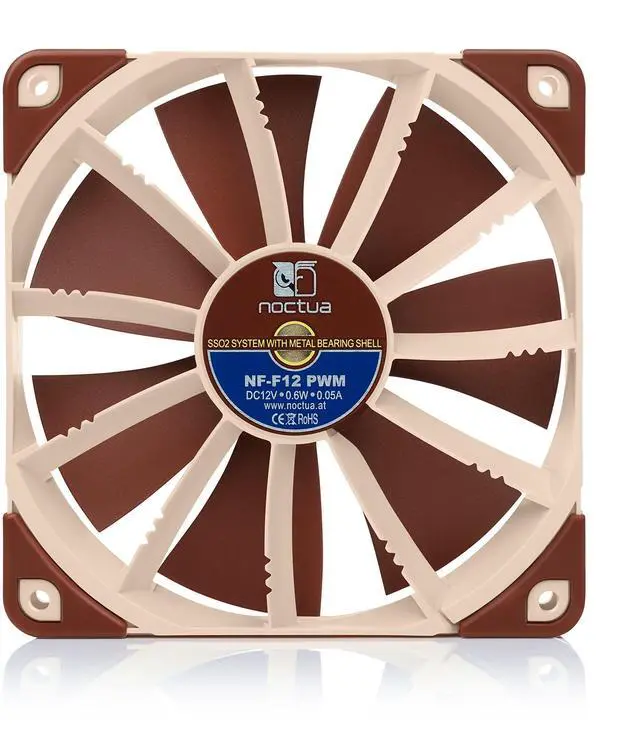 Premium quiet fan, 120x120x25 mm, 12V, 4-pin PWM, max. 1500 RPM, max. 22.4 dB (A), >150, 000 h MTTF ^^ Award-winning 120x25mm fan with Focused Flow frame for high static pressure and superior quiet cooling performance ^^ Ideal for CPU heatsinks (e. g. Noctua NH-U12 (S) series) and water cooling radiators, perfect replacement fan for loud all-in-one (AIO) coolers ^^ 4-pin PWM version for automatic speed control via 4-pin PWM fan headers, broad 300-1500rpm speed range (1200rpm max. with supplied Low-Noise Adaptor) ^^ Includes anti-vibration mounts, fan screws, Low-Noise Adaptor, extension cable and y-cable for running two PWM fans on the same header