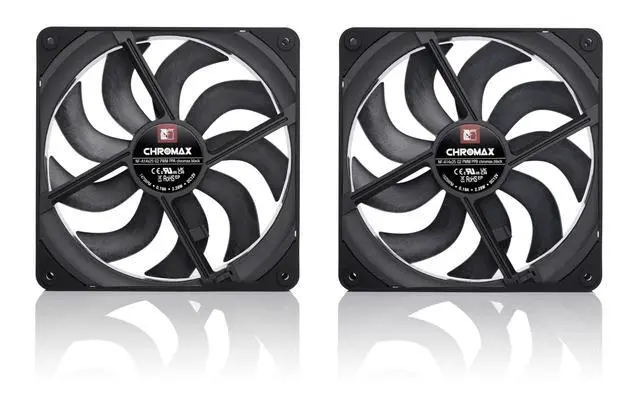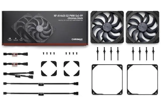 Dedicated dual fan set with two NF-A14x25 G2 PWM 140x25mm fans that are slightly off-set in speed (+/- ~25rpm) in order to avoid undesired acoustic interaction phenomena ^^ State-of-the-art engineering (Progressive-Bend impeller with winglets and Centrifugal Turbulator, Flow Acceleration Channels, AAO frame) and construction (Sterrox LCP, ultra-tight tip clearance) ^^ Ideal choice for push-pull applications as well as situations where two fans are operating side by side (280mm water cooling radiators, case intake or exhaust fans, etc. ) ^^ All-black chromax version with black anti-vibration mounts, 14cm anti-vibration gaskets for tighter seal on radiators, fan screws, Low-Noise Adaptors (L.