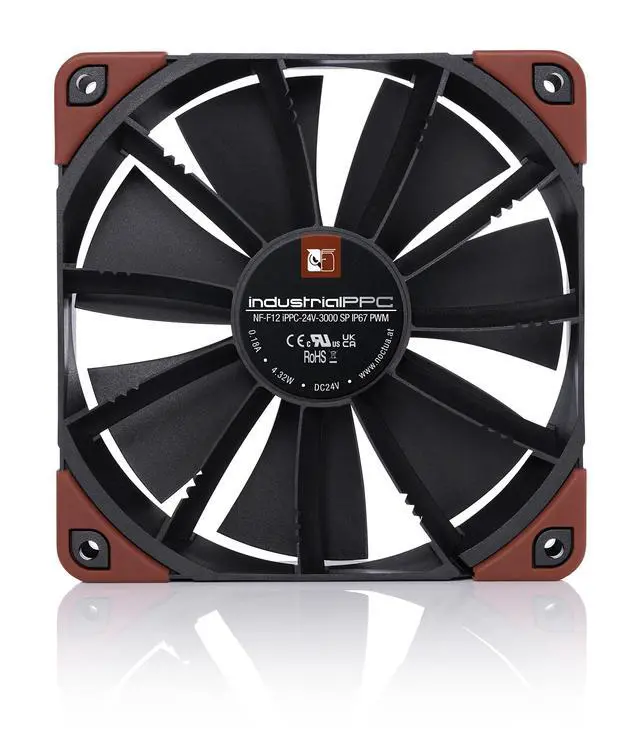 Heavy duty cooling fan, 120x120x25 mm, 24V, 4-pin PWM, IP67 certified, max. 3000 RPM, max. 41, 5 dB (A), > 150.000 h MTTF ^^ Award-winning 120x25mm fan with Focused Flow frame for high static pressure and superior cooling efficiency ^^ 24V, 3000rpm industrialPPC (Protected Performance Cooling) version with 4-pin connector and PWM speed control (1600rpm max. in 12V PC environments) ^^ High-speed industrialPPC version for industrial heavy-duty applications that require extreme cooling performance and advanced ingress protection ^^ Ruggedised fibre-glass reinforced polyamide construction and IP67 certified water and dust protection