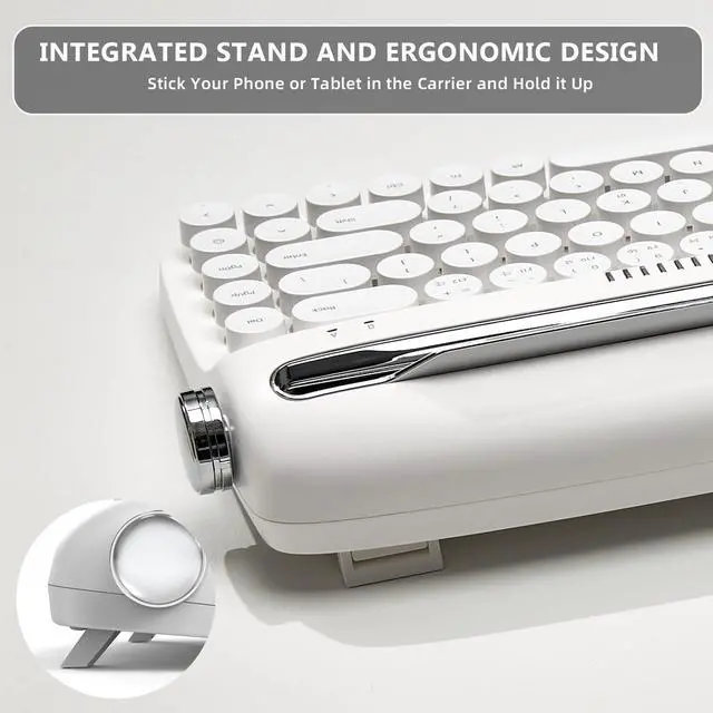 VINTAGE TYPEWRITER KEYBOARD WITH INTEGRATED STAND: The wireless typewriter keyboard includes an integrated stand holder for pad, phone and tablet, which matches the vintage aesthetic of your desk and home office. The retro keyboard also includes adjustable feet, allowing you to set the angle